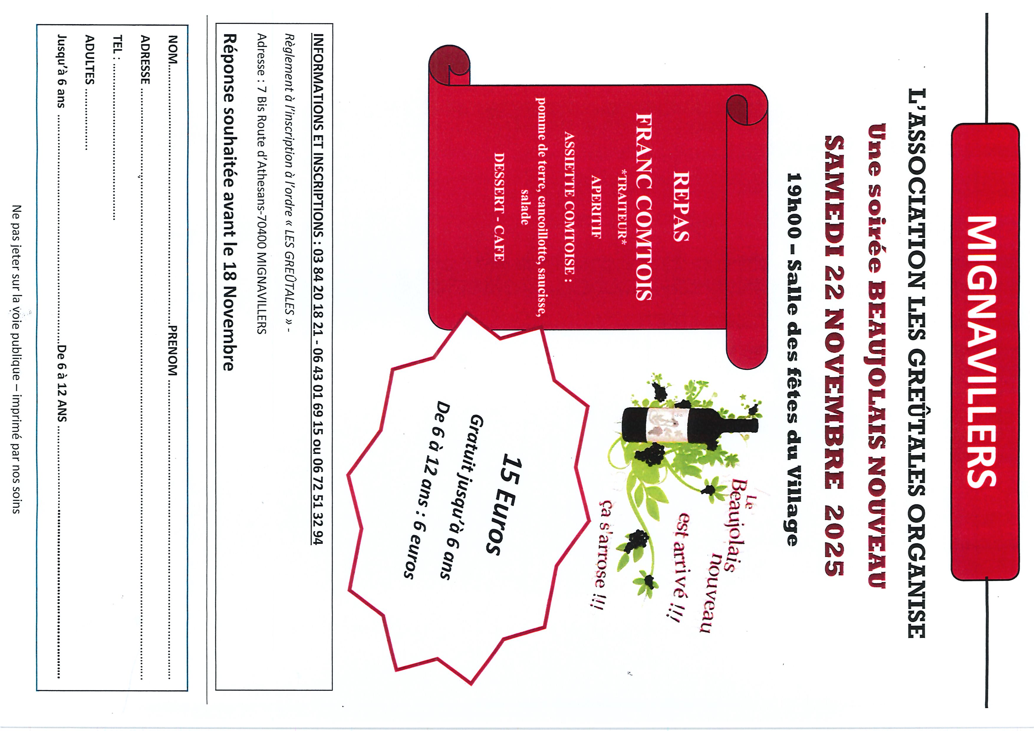 Der Verein Les Greutales de Mignavillers organisiert ein Essen zum Ausklang des Beaujolais Nouveau. Reservierung vor dem 18. November.